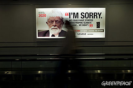 En los anuncios que cubren el aeropuerto pueden verse imágenes de Lula, Obama Sarkozy, Merkel y otros jefes de Estado tal y como se verían en 2020. (Greenpeace/Christian Slund)