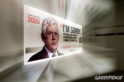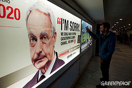 Greenpeace lanzó una polémica campaña por el cambio climático y envejeció a los líderes mundiales. Así que quien llegue al aeropuerto de Copenhague podrán ver los afiches que muestra las caras de los jefes de Estado de EE.UU., Barack Obama; de Brasil, Lula Da Silva; de Francia, Nicolas Sarkozy; de Alemania, Angela Merkel, de España, José Luis Rodríguez Zapatero, y de Gran Bretaña, Gordon Brown, con una apariencia similar a la que tendrían en el año 2020.
