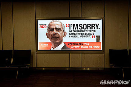 El mensaje de Greenpeace también se dirige a Barack Obama, en el año 2020, cuando ya no se pueda hacer nada contra el cambio climático. (Greenpeace/Christian Slund)