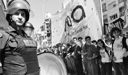 Libros y garrotes. Una fuerte custodia policial impidió que fuera ocupada la sede del Rectorado en la calle Viamonte. |