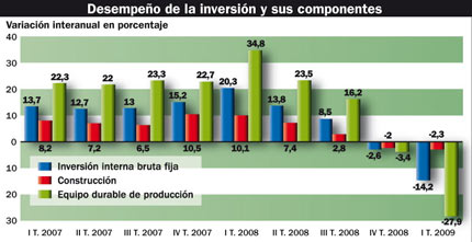 La consultora OJF, que dirige Orlando Ferreres estima que en mayo, la inversión cayó 20,1% respecto de igual mes del 2008. La inversión representa 19,5% del PBI, un nivel similar al que había en 2005, es decir, se perdieron 4 años.