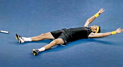 Se tiró de espaldas, tan largo como es, sobre el cemento que desde ayer es uno de sus mejores compañeros. Se quedó inmóvil, unos segundos, con los dos brazos abiertos. Se paró, no sabía dónde ir ni qué hacer. Se tomó la cara con ambas manos: varias lágrimas ya corrían por su mejilla. Se saludó con Federer y terminó abrazado con su ídolo, todavía con la red de por medio. Se agarró la cabeza; una, dos, cinco veces. Se fue, decidido, en busca de su equipo y se fundió en abrazos interminables y conmovedores con Franco Davin (su coach; el tipo que le cambió el juego y la mentalidad), con Martiniano Orazi (su preparador físico) y con Ugo Colombini (su agente). El estadio, sacudido por 23.763 personas emocionadas y agradecidas por semejante espectáculo, estallaba. Por los altoparlantes se escuchaba la música de "Matador"... El matador estaba allá abajo, en el court azul. Era campeón, Juan Martín Del Potro. Flamante campeón del US Open, el torneo que soñó desde que soñaba sueños en Tandil.
