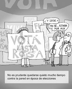 La característica sábana multicolor de afiches de todas las agrupaciones colgando del techo recibe a los estudiantes de Ciencias Sociales. “¿Sos de Sociología o de RT?” (Relaciones del Trabajo), preguntan sin cesar los militantes antes de entregar el volante indicado, porque también se votan representantes para las juntas de carreras. En el edificio de Marcelo T. de Alvear al 2200 no hay lugar para más anuncios de ningún tipo. En el piso también hay pegados carteles con propuestas para el centro de estudiantes y el consejo. Las ventanas están ocupadas, los cables, las barandas de las escaleras e incluso los escalones tienen inscripciones alusivas. En el tercer piso, lugar de la votación para Sociología, los alumnos hacen cola en las mesas. “Macri”, anuncia poniendo voz de chanza una de las autoridades de mesa con la cédula de un chico en la mano. “El chiste me lo hacen seguido, pero lo peor es que trabajo con un contrato precario en el gobierno de la ciudad”, se quejó antes de entrar en el cuarto oscuro.