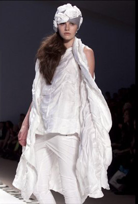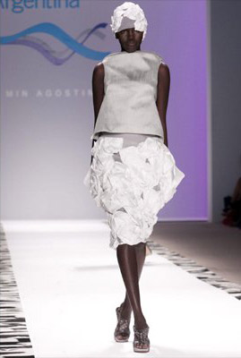 Fiel a lo que le caracteriza, Agostini trajo a la pasarela de la Semana de la Moda trajes blancos, amplios, otros arrugados, plisados, prácticamente sin costuras acompañados de tocados, influenciados por su conocimiento del espacio como arquitecta.